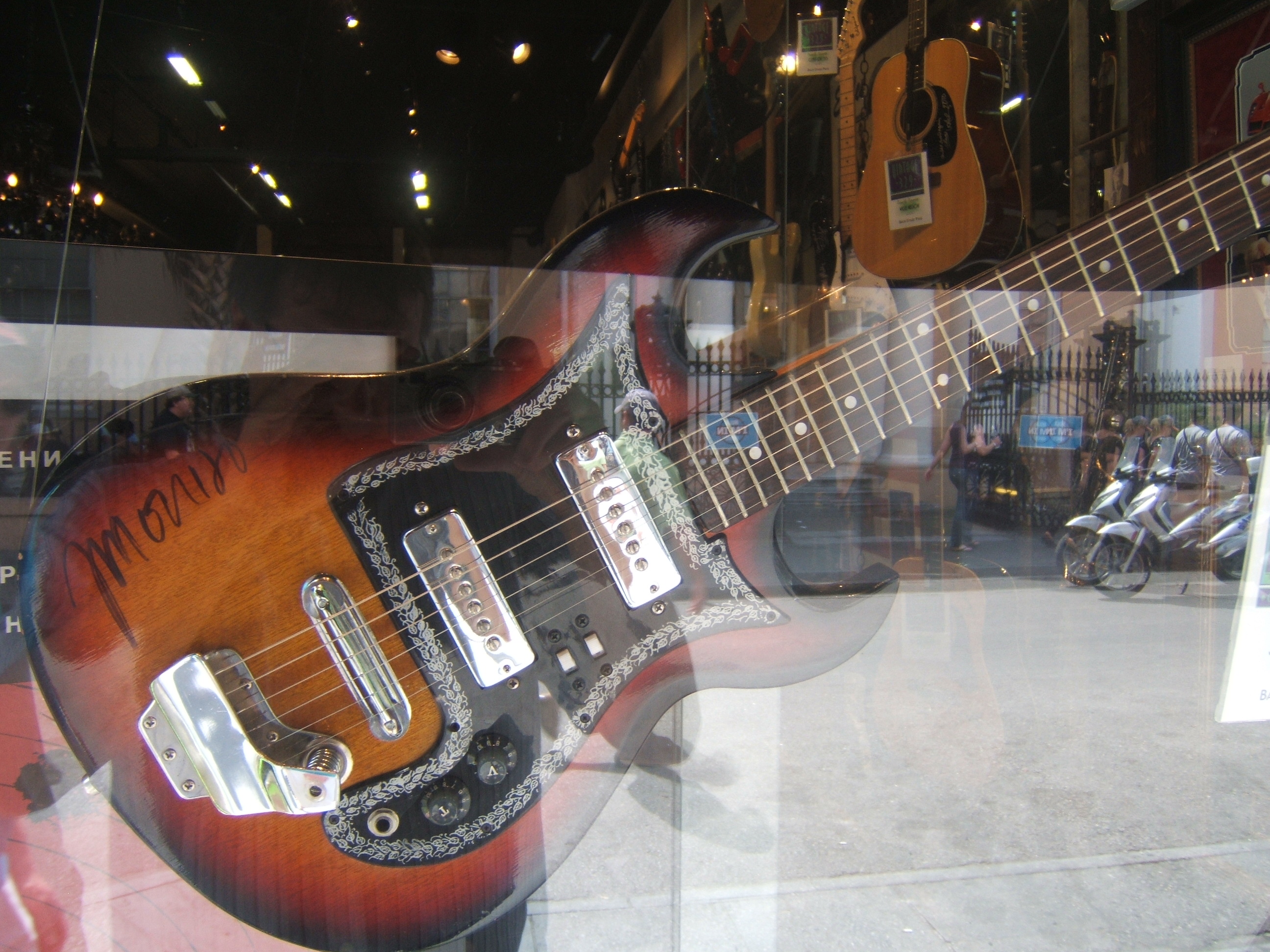 Fun to watch, and this continued all the way down the street.  We were heading for the street cars to head over to the Garden District.  On the way I noticed a music store.  In the window of this store was a guitar.  The guitar was used and autographed by Jim Morrison and was for sale for only $50,000.