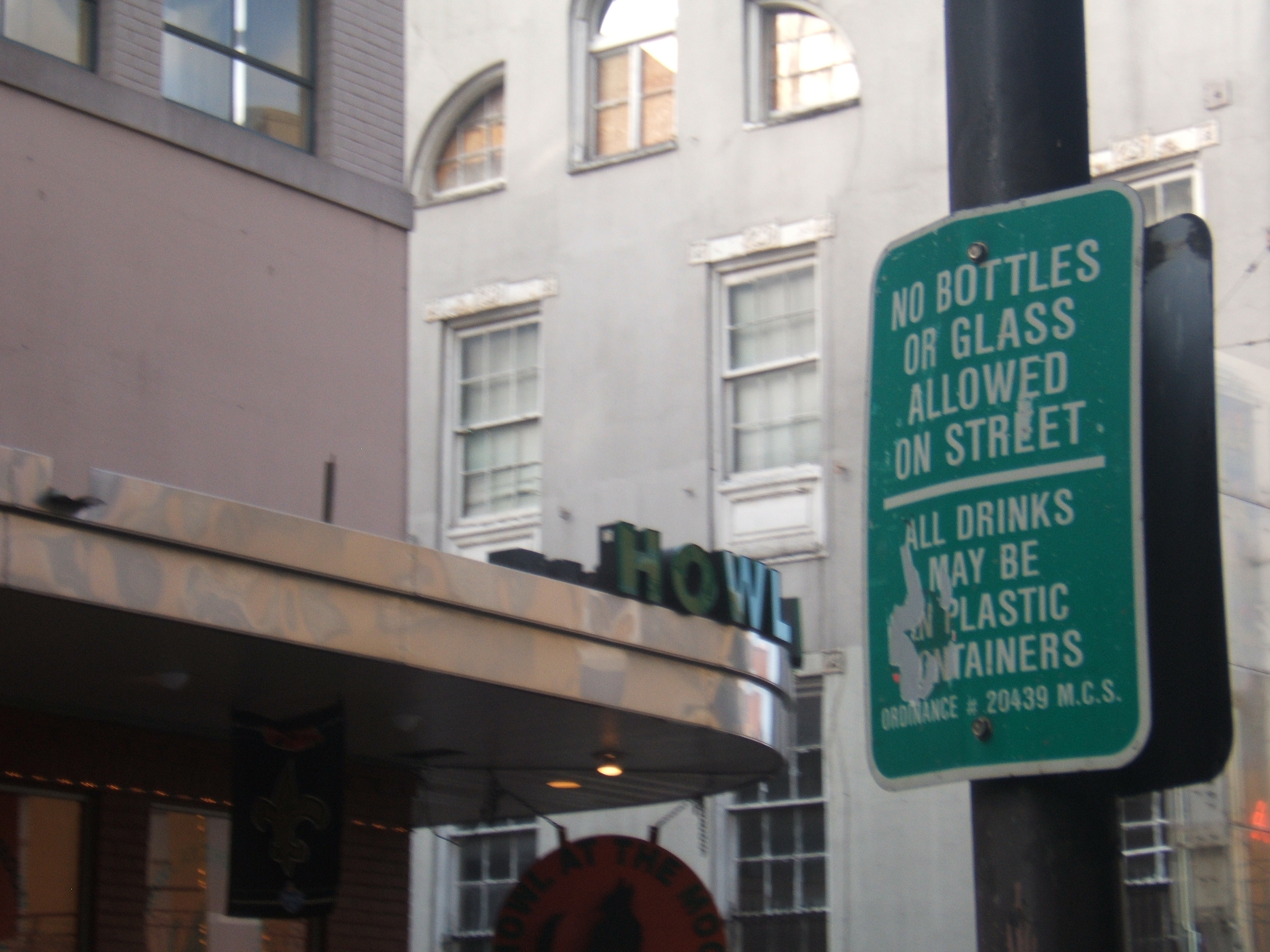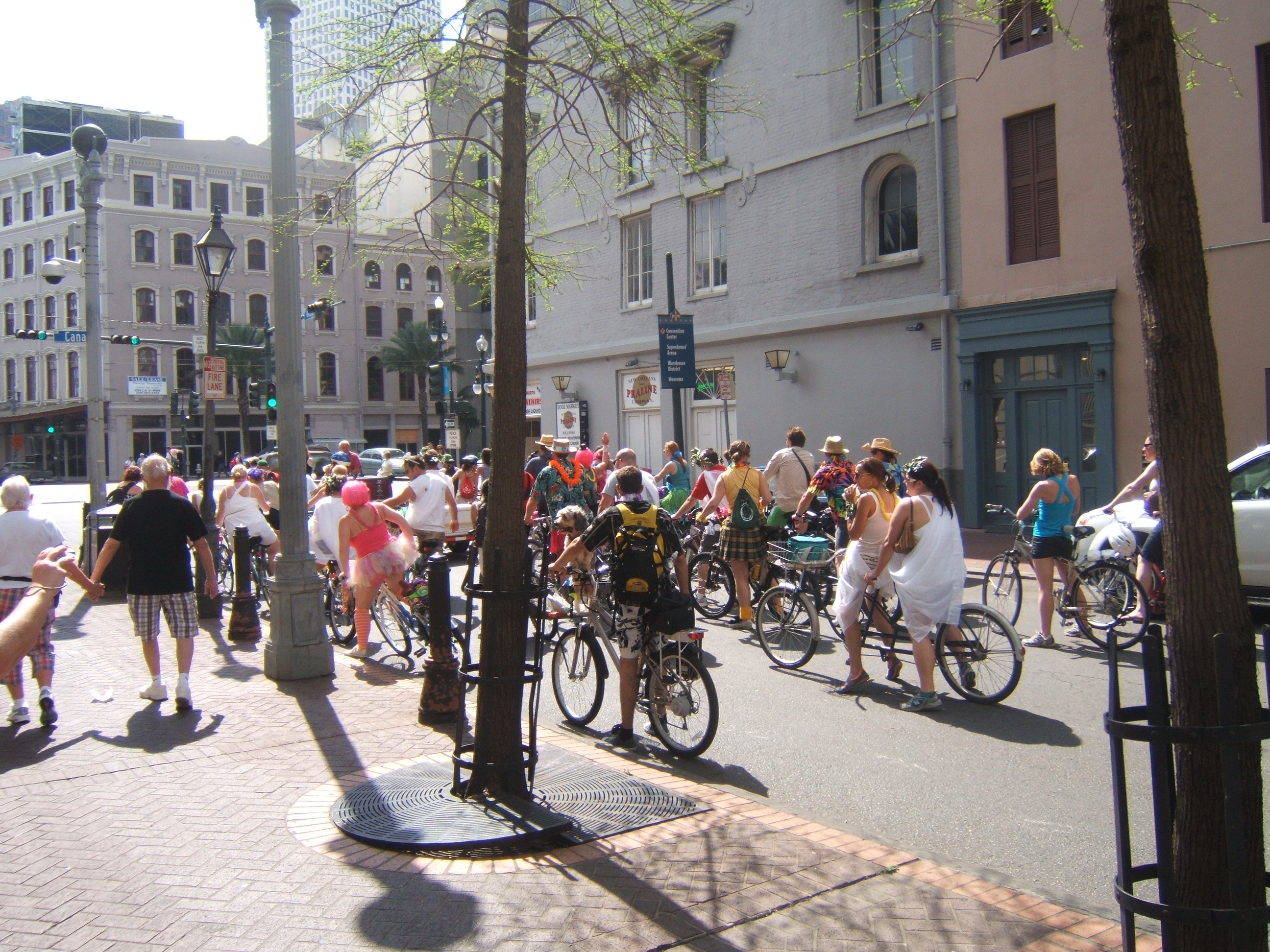 We headed back and caught the street car back to the French Quarter.  Cec and John were tired so they cabbed back to the cottages.  We decided to carry on.  As we crossed over to Decataur St., we ran into yet another parade, this time bicycles.  Also note the sign, these are everywhere in the Quarter.  You can drink anywhere, just don’t use glass.