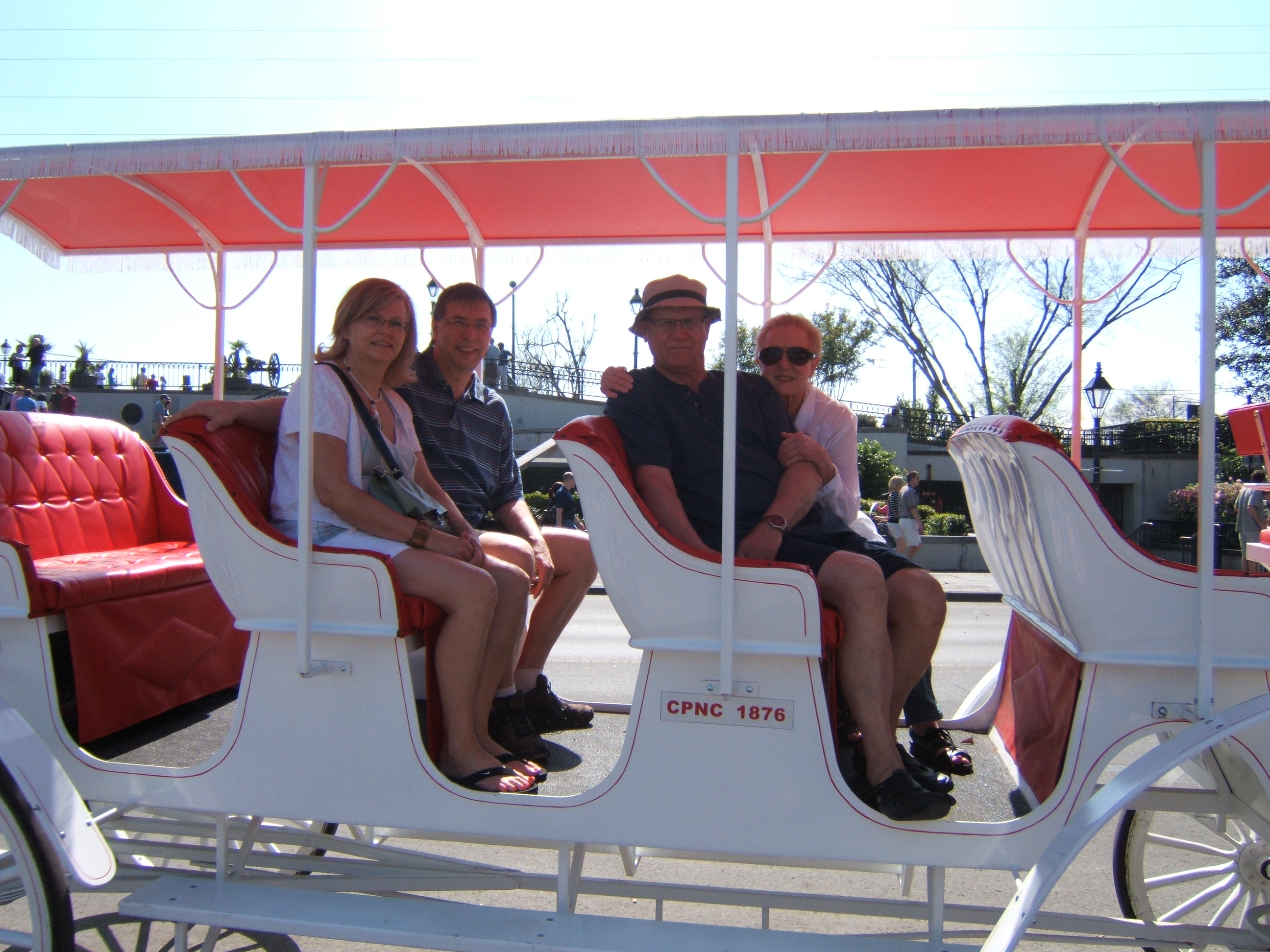 This type of “Busker” entertainment is everywhere.  We have seen in almost every place we go, and is an interesting way to earn.  Busking is a fine art these days, the good ones are very good, then there are the ones who are not so good.  At any rate, Lori and Cec enjoyed the show and we were off.  We made it at least half a block before we decided to do a buggy ride through the Quarter.  These are pulled by Mules only by civic law as they handle the heat better than horses, apparently.  I will have to take their word on that.